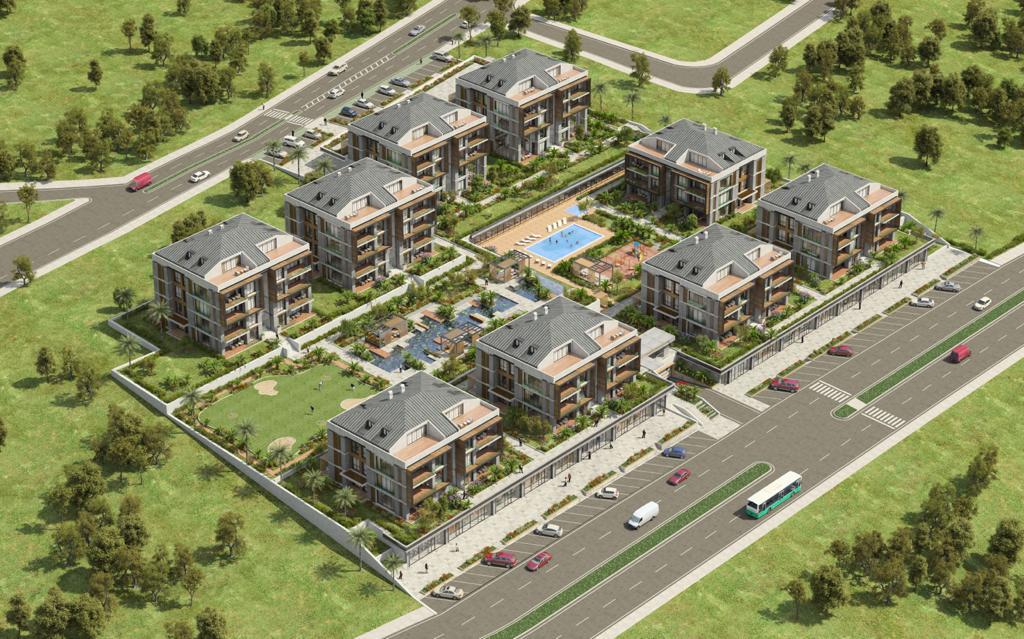 10.800 m2 peyzaj alanı içinde her daire için yaklaşık 200 m2 yeşil alan. Geniş bahçe katları, çatı ve ters dubleksler.